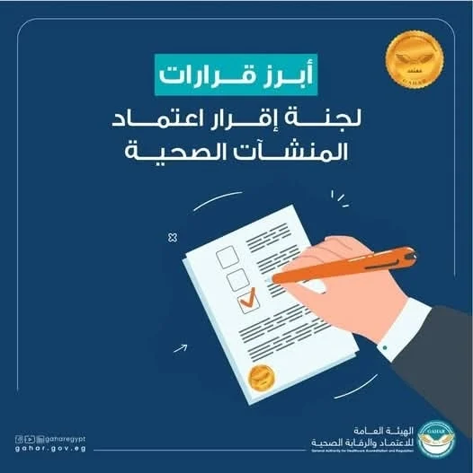 أعلنت الهيئة العامة للاعتماد والرقابة الصحية برئاسة الدكتور أحمد طه، في بيان رسمي لها اليوم، عن أحدث قرارات اللجنة العليا للاعتماد حيث حصلت (19) منشأة صحية على الاعتماد (الكامل/ المبدئي) أو جددت اعتمادها ، وفقا للمعايير الصادرة عن "GAHAR"، والحاصلة على الاعتماد الدولي من "الاسكوا"، وذلك بعد تقييم الخدمات الصحية بهذه المنشآت والتأكد من استيفائها لكافة المتطلبات اللازمة.